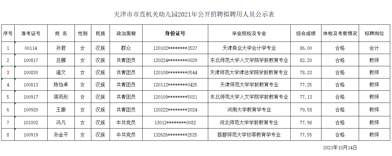 天津市市直機關幼兒園2021年公開招聘工作人員工作,經筆試、面試、體檢、考察等環節,共8人符合條件。按照《天津市市直機關幼兒園公開招聘工作方案》現將擬聘用人員予以公示。