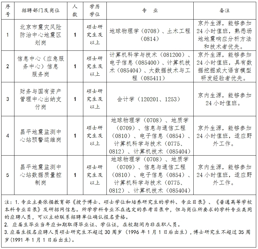 為滿足事業單位補充工作人員需要,根據《事業單位人事管理條例》《事業單位公開招聘人員暫行規定》《中國地震局進人管理辦法》《北京市地震局公開招聘事業單位工作人員實施辦法》等有關規定,2026年北京市地震局局屬事業單位擬面向社會公開招聘5名碩士研究生及以上學歷應屆畢業生?,F將有關事項公告如下。