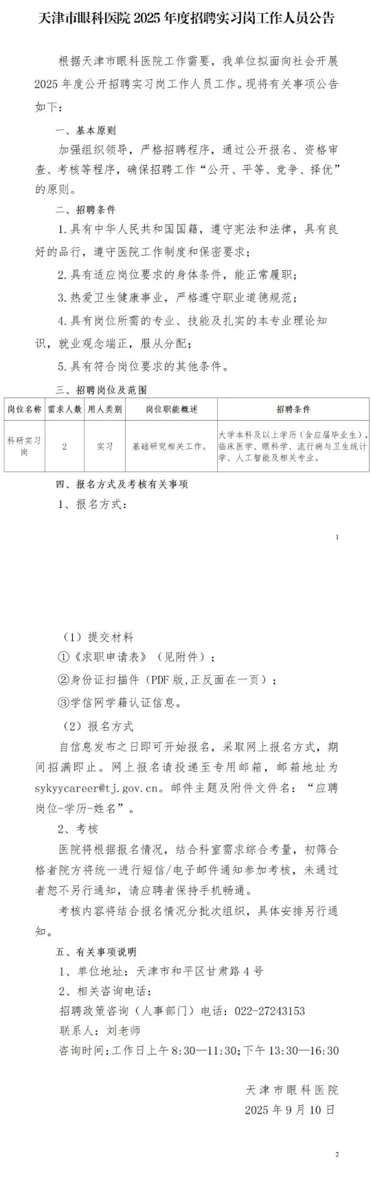 天津市眼科醫院2025年度招聘實習崗工作人員公告