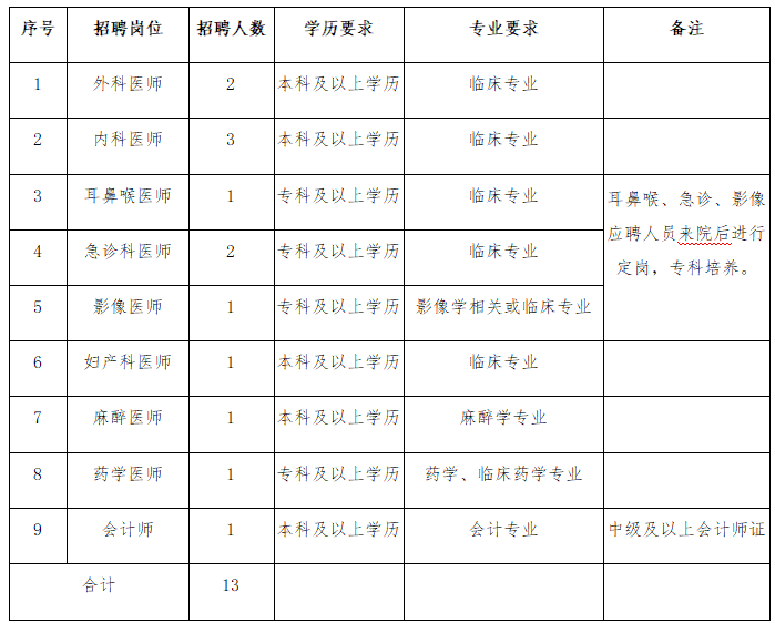 此次計劃招聘醫務人員13名。具體崗位、人數等詳見下表: